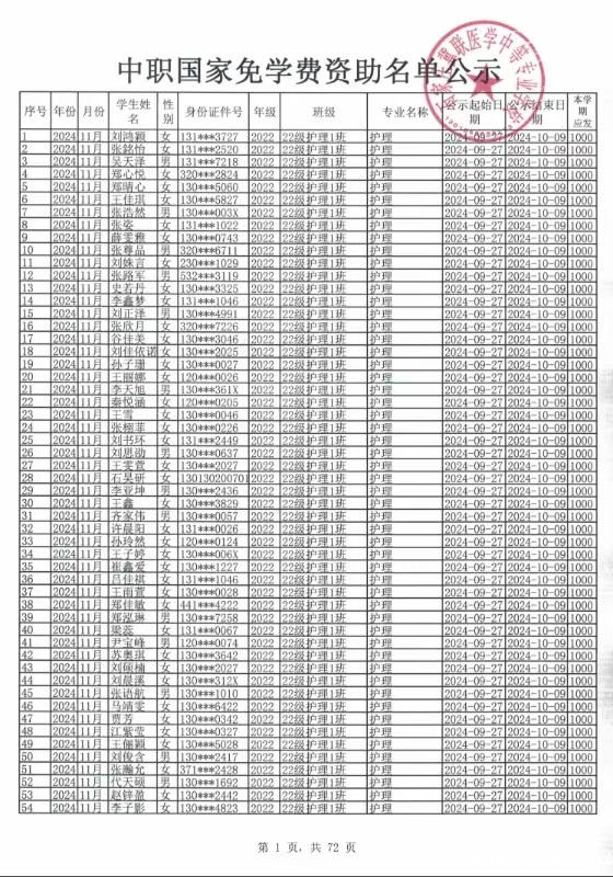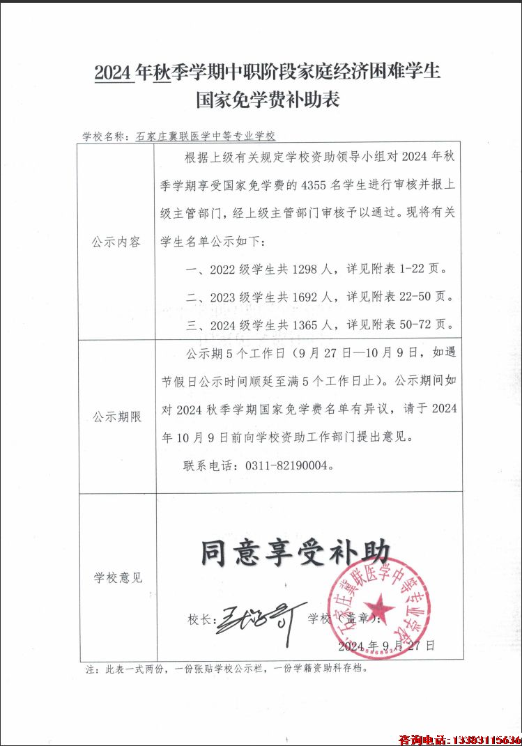 石家庄冀联医学中等专业学校2024年秋季中职国家免学费资助名单公示