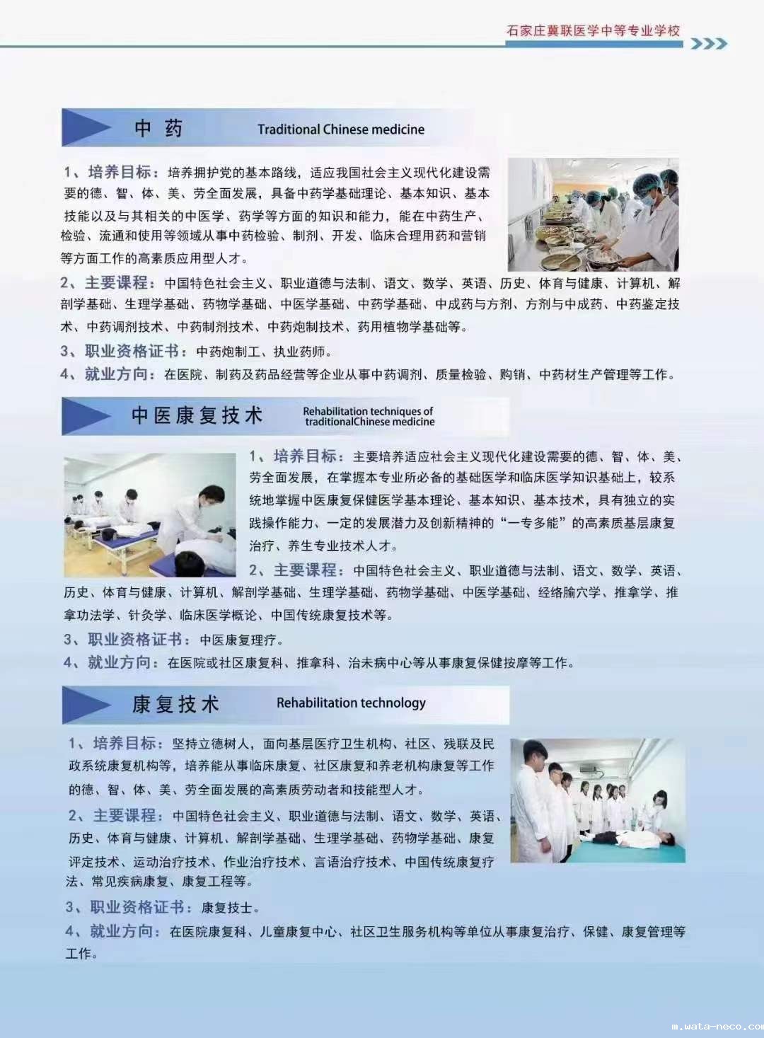 培养目标:本专业坚持立德树人,面向基层医疗机构,社区,残联及民政系统康复机构等,培养从事临床康复,社区康复和养老机构康复等工作,德智体美全面发展的高素质劳动者和技能型人才。
